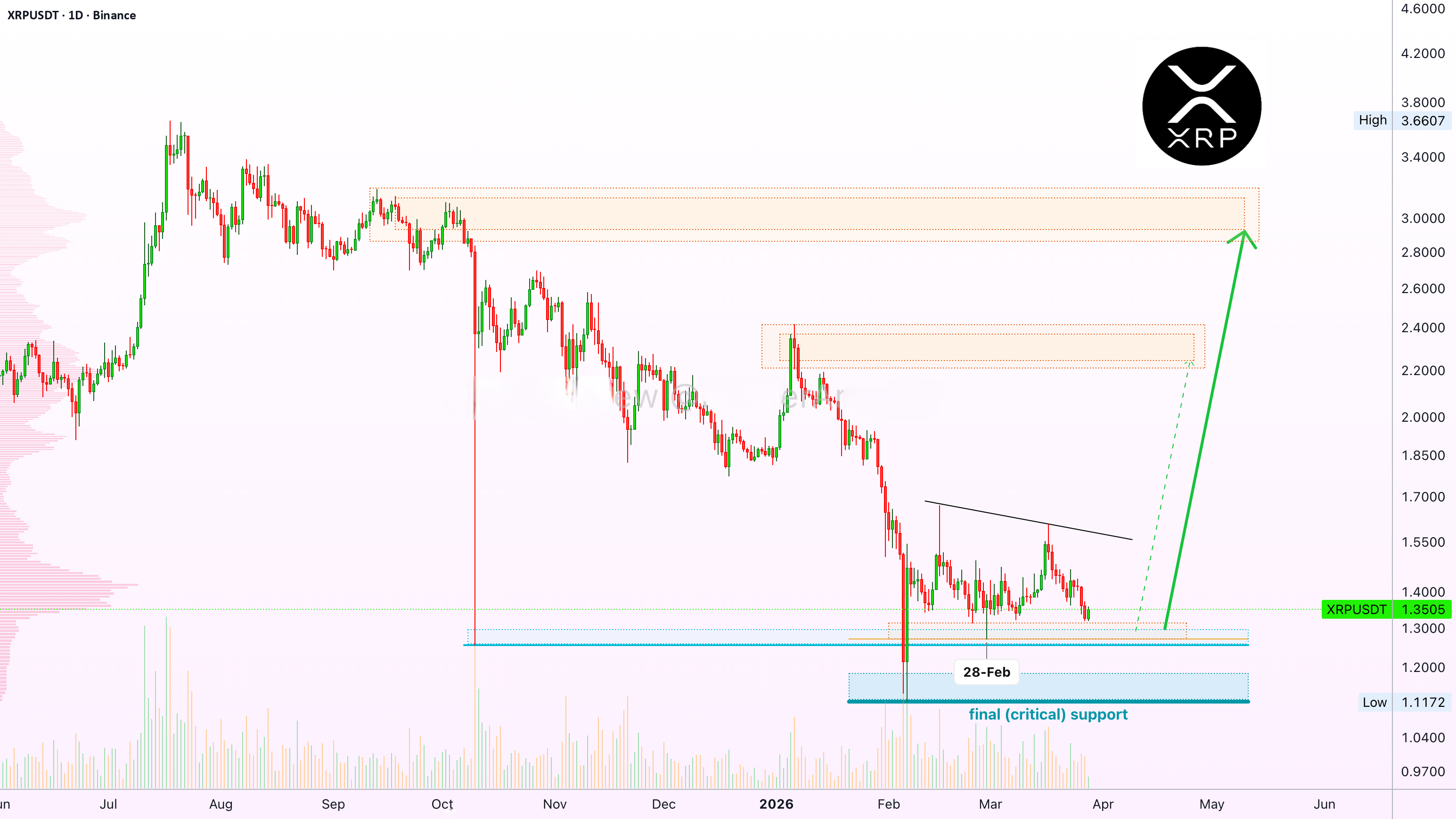 Current consolidation: The price is currently stabilizing above another minor support level (marked by a light blue double line above the critical support), around $1.28 - $1.30. This consolidation indicates liquidity accumulation.