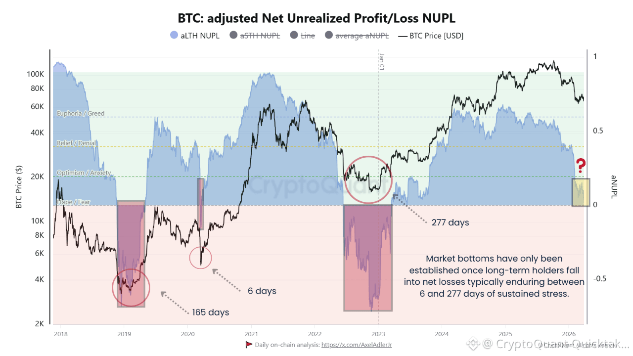 Across prior cycles, Bitcoin market bottoms have consistently formed only once LTHs were pushed into net unrealized losses, a phase where conviction is tested and capital undergoes sustained stress, typically lasting between 6 (2020 flash crash) and 277 days.