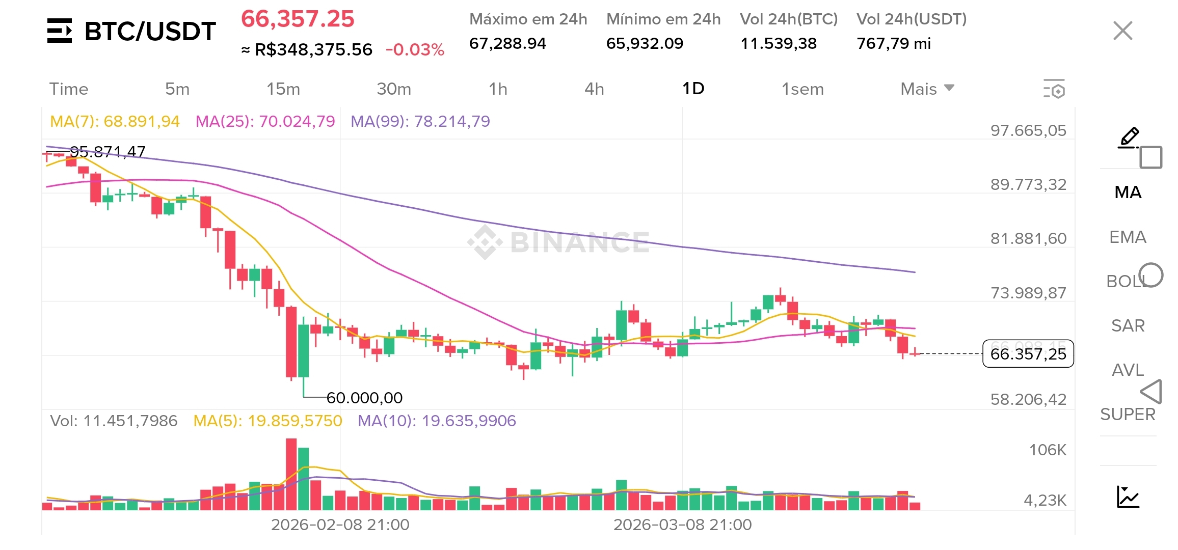 The scenario for Bitcoin ($BTC ) on the daily chart has triggered the yellow signal! ⚠️ Currently priced at 66,357, the king of cryptos is struggling not to give up more ground to the bears.