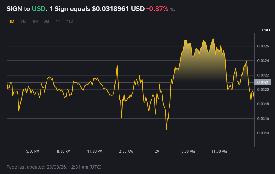 $SIGN is at $0.0318 today. market cap $52.3M. 1.64B circulating out of 10B max. 79% below ATH. Date: March 29, 2026. sign token spot link.