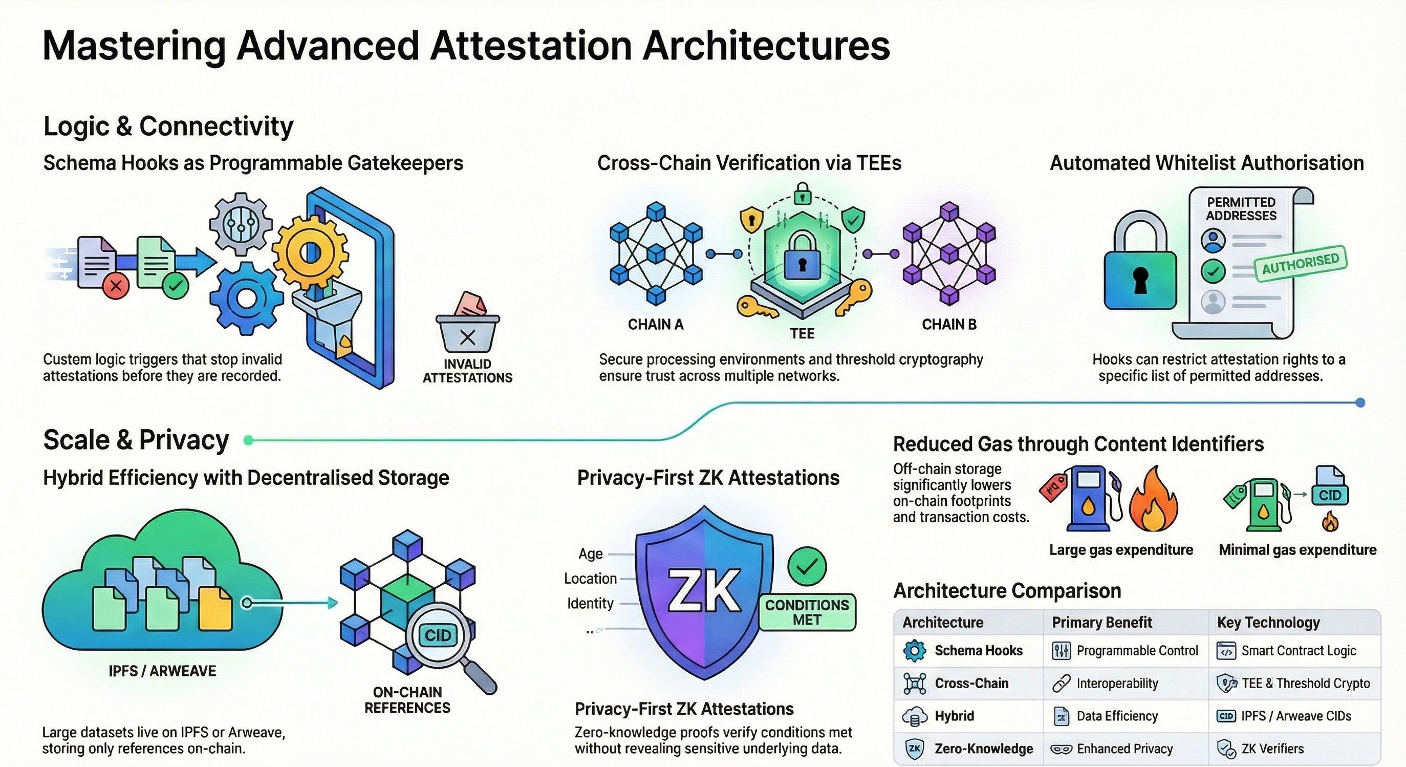 Hybrid attestations offer another approach for handling data. Instead of storing all information directly on chain, the actual data is stored on decentralized storage systems such as Arweave or IPFS. Only a reference to that data, usually a content identifier, is stored within the attestation itself. This makes the process more efficient and reduces costs, especially when dealing with large datasets.