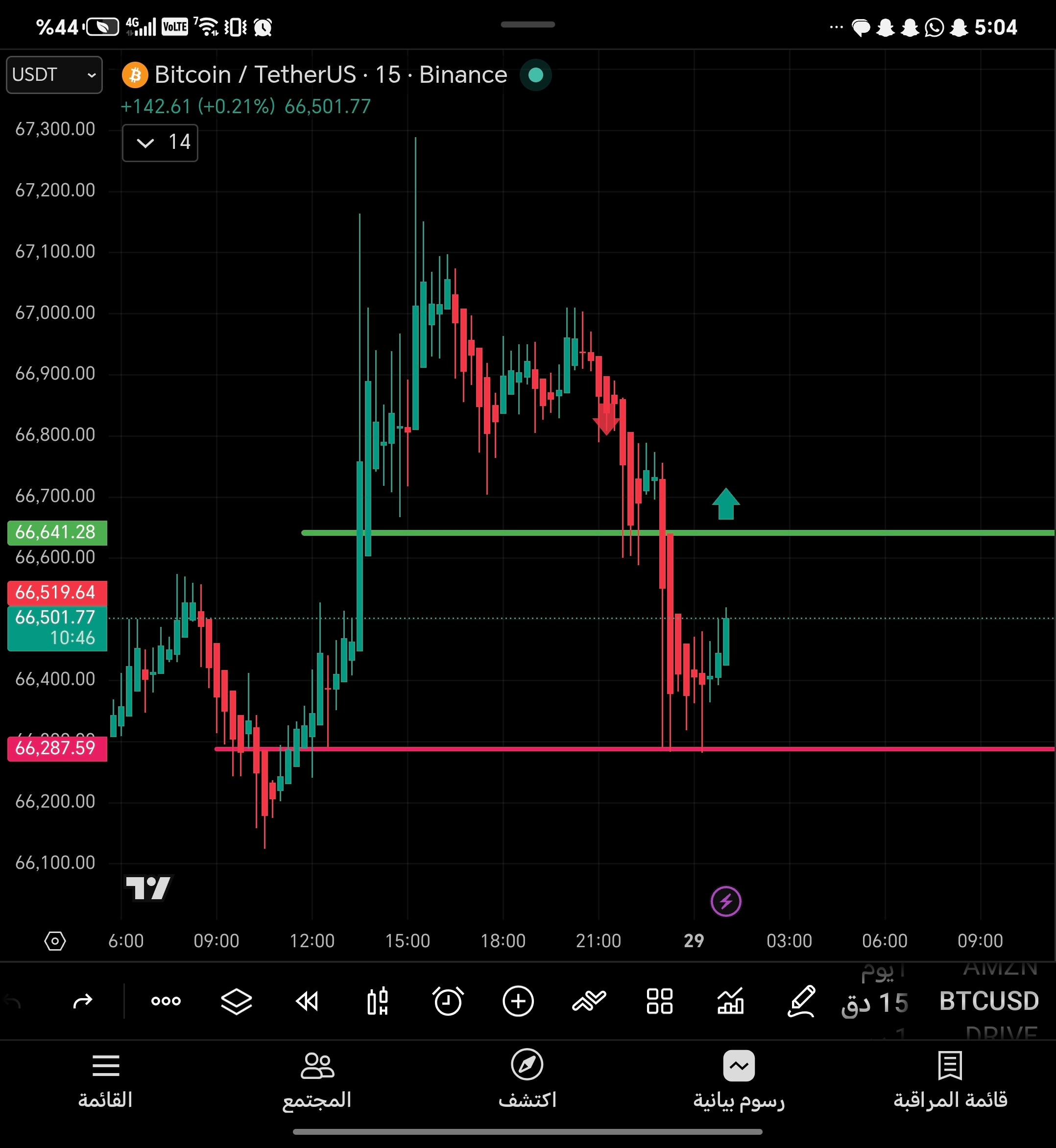 1. **Entry Point**: A green candle closes **above 66,641.28** (the green line)