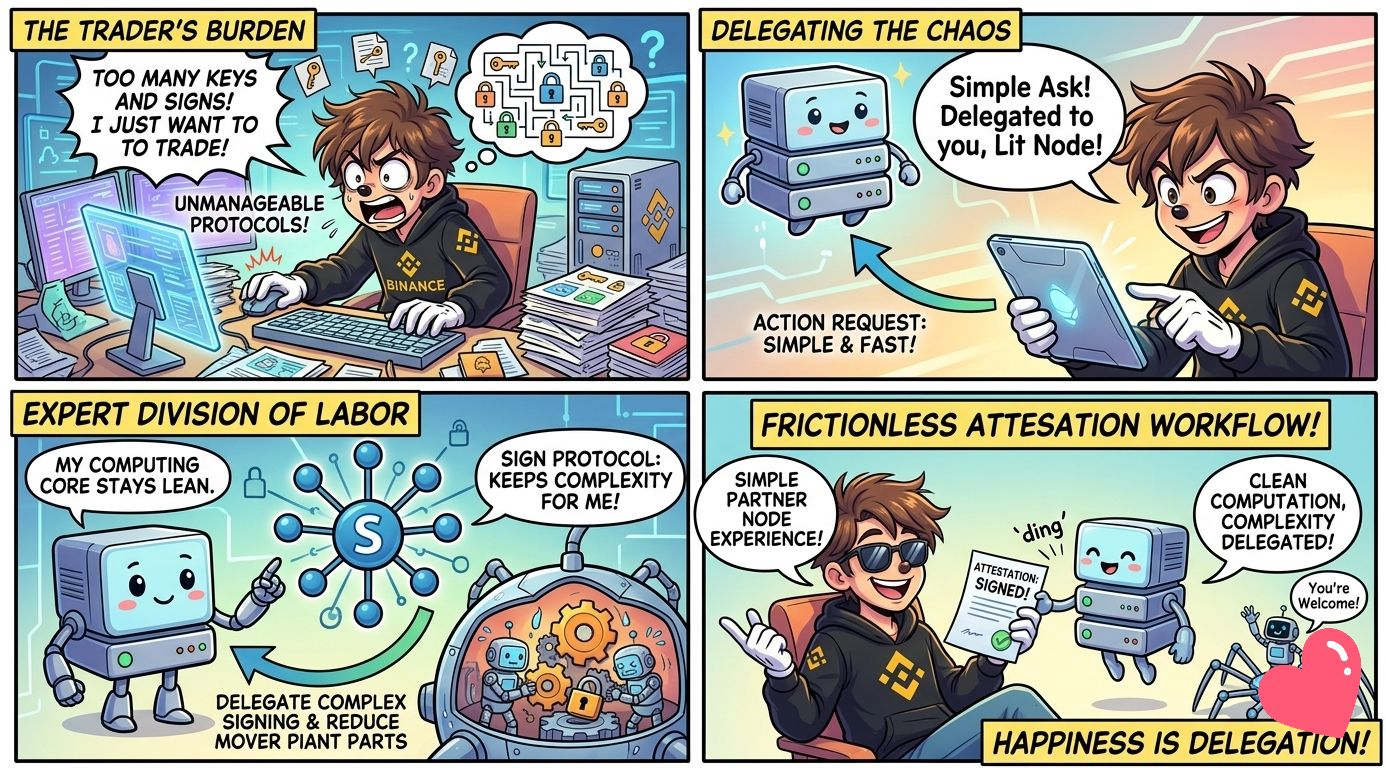 😁 Here’s the part that made me actually nod. Sign Protocol handles delegated attestation for Lit nodes. The nodes don’t have to carry the full burden themselves. Sign steps in and signs on their behalf. From a trader’s perspective? I like setups that reduce friction. Fewer moving parts usually means fewer things break when volatility hits and everyone starts panic-clicking.