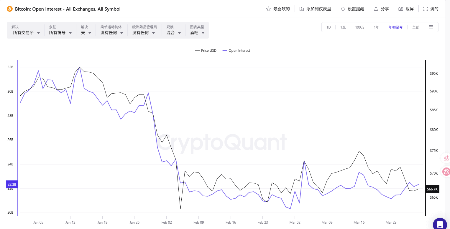 After that, OI began to slowly recover: 22B → 23B → 25B. But in recent days, it has fallen back from 25B to 22.3B, while the price has dropped from $75,000 to $66,700.