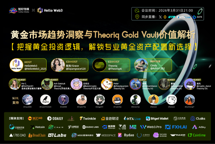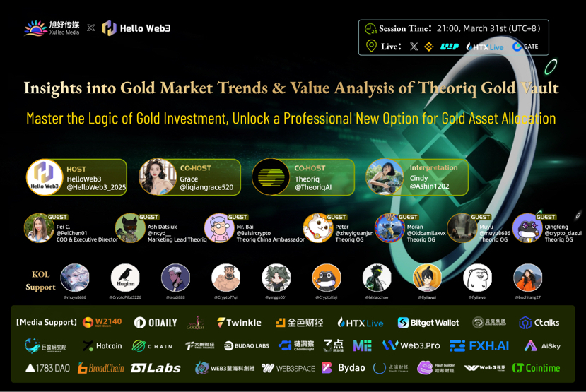 In this Space session, we are honored to be joined by many well-known industry KOLs and the Theoriq team to discuss the gold market. We will first focus on the current trend and future opportunities of the gold market, analyze the investment logic, then dive into the core advantages of Theoriq Gold Vault as a gold asset allocation tool. We believe the professional insights from all guests will bring fresh perspectives to your gold investment decisions.