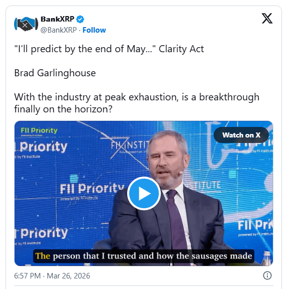 Garlinghouse previously suggested the CLARITY Act could pass in April, referencing prediction markets. However, this interview provides a more concrete timeline. If it passes, institutional adoption could accelerate. Legal certainty reduces friction for financial operations, making XRP a more practical tool for payments and settlements.