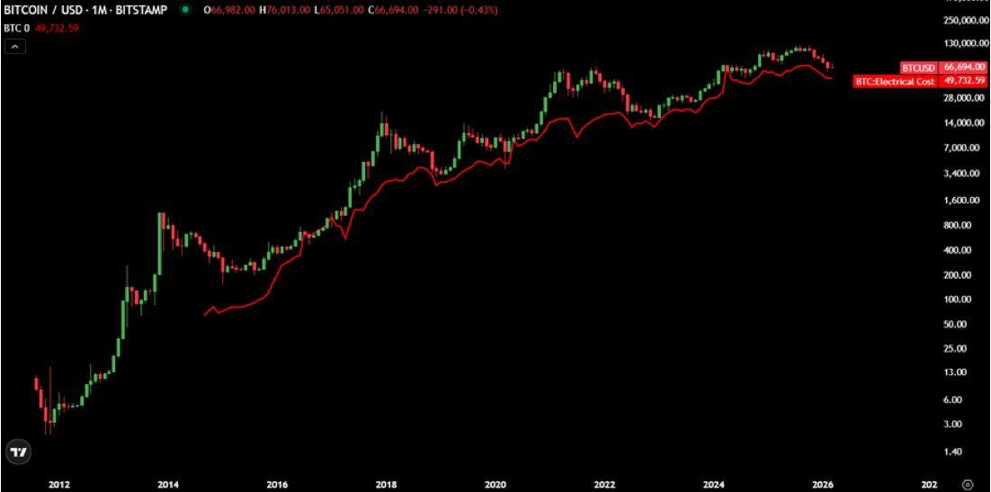 Bitcoin's macro structure remains intact heading into this cycle, but the foundation beneath it is evolving. According to Crypto Rover, the estimated electrical cost of mining Bitcoin has dropped below $50,000 - a development that suggests the lower boundary of the market cycle is no longer rising the way it used to.