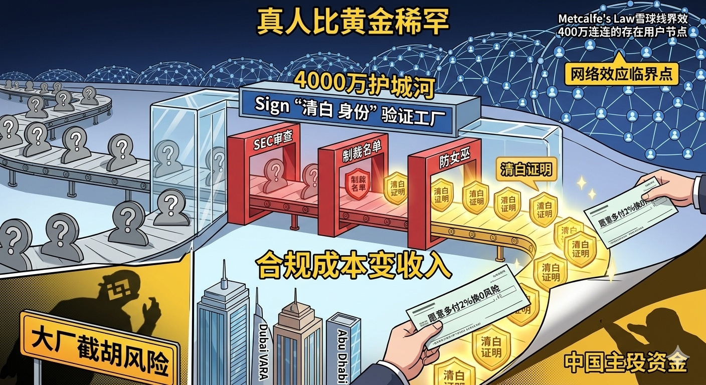 不过账算得再好,也得满足三个条件。首先,这 4000 万得真的是真人。哪天被曝出大部分是刷子,这账本瞬间作废。其次,中东得持续进场。地缘政治缓和了,或者监管风向变了,"合规溢价"就不值钱了。第三,没有大厂截胡。币安明天如果推出同样的验证系统,靠着 1 亿用户基础,Sign 这 4000 万就不够看了。