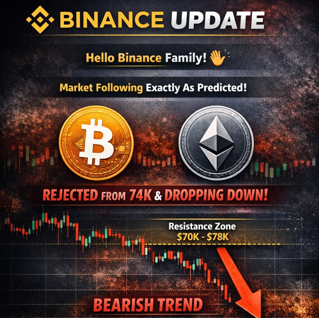 As discussed earlier, $BTC & $ETH along with most altcoins followed the exact scenario I mentioned — rejection from the 74K zone and continued downside movement. And now, you can clearly see where the market stands.