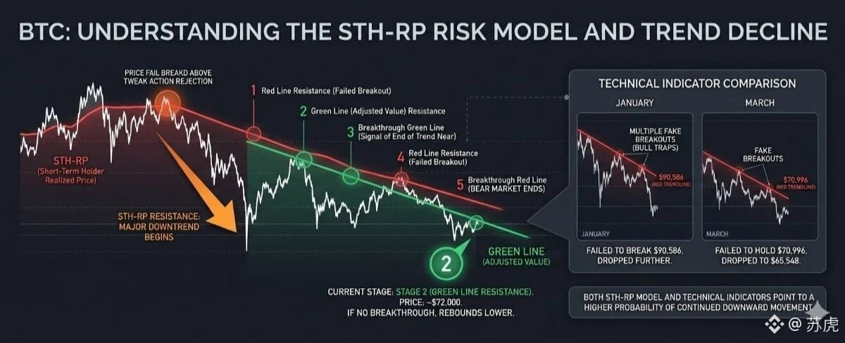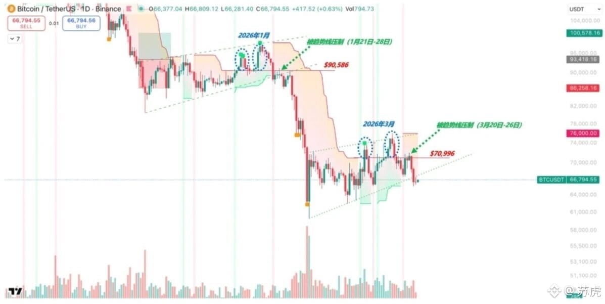 比如在1月21日-28日期间,BTC就是持续无法突破$90,586(红色趋势线),最终选择了继续下探。而这一次在3月20日-26日期间又是无法有效站上$70,996后向下至$65,548。