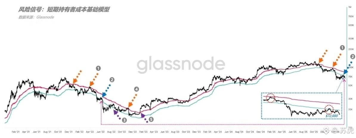 当#比特币 的价格被STH-RP压制,意味着价格在触碰到短期筹码成本均线时就会产生大量抛压,所以才无法突破,这往往都是一段大级别下行趋势的开始(如图中橙色箭头所指)。