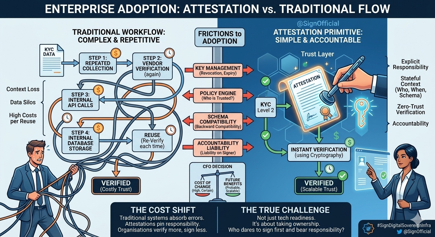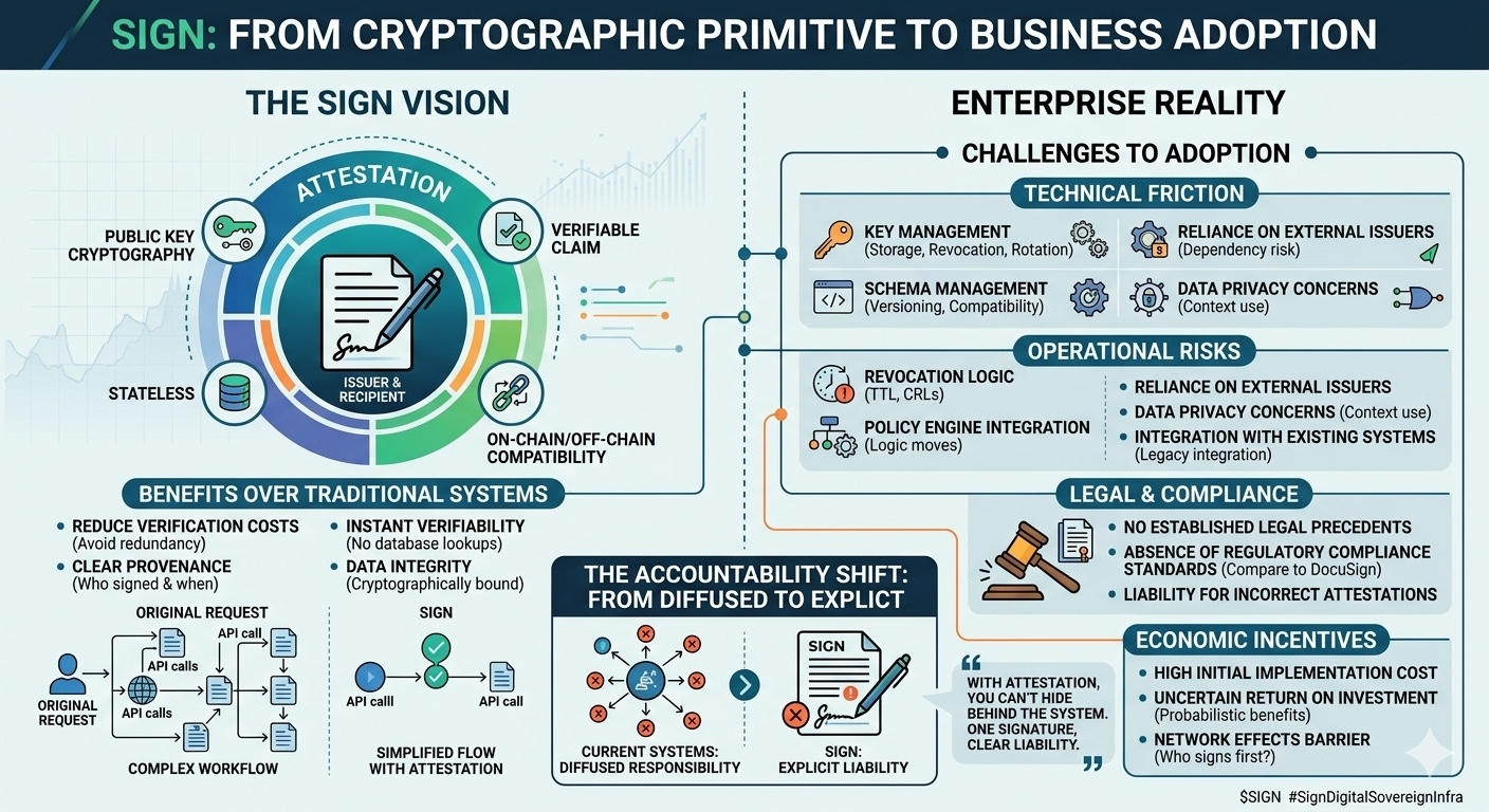 Một insight quan trọng. Sign không chỉ giảm trust cost. Nó tăng accountability cost. Bạn không còn ẩn sau hệ thống bạn đứng sau chữ ký.