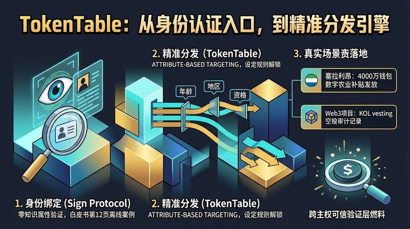 The white paper states very clearly: TokenTable is directly integrated with the Sign Protocol, using on-chain identity authentication to perform 'Attribute-Based Targeting'—precisely distributing based on identity attributes. Your age, region, and qualification status can all serve as distribution conditions, and on-chain records are kept, with every transaction having an immutable audit trail. This is a necessity for governments and equally a necessity for Web3 projects.