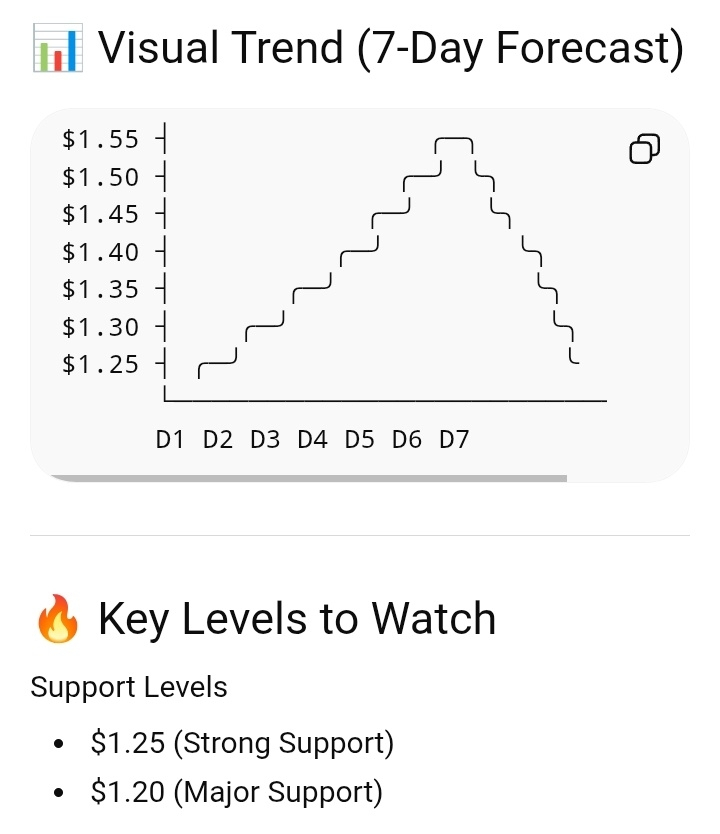 DayForecast PriceTrendDay 1$1.85 — $1.95Slight BullishDay 2$1.88 — $2.00BullishDay 3$1.80 — $1.92Small CorrectionDay 4$1.90 — $2.05RecoveryDay 5$1.95 — $2.10Bullish BreakoutDay 6$2.00 — $2.18Strong BullishDay 7$2.05 — $2.25Weekly High Possible
