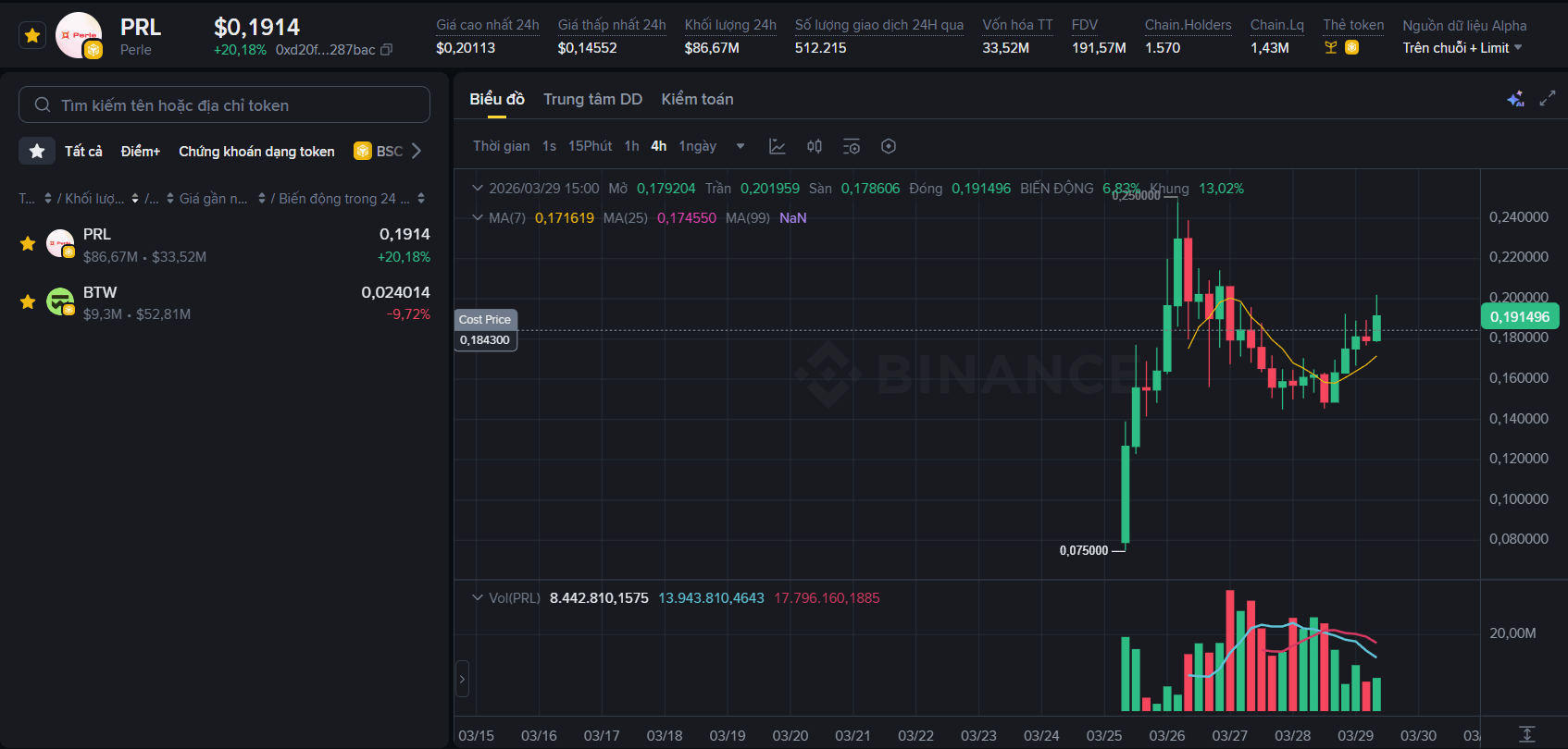 Như chúng ta đã thấy, PRL phản ứng rất nhạy với nhịp hồi của BTC (như cú bật từ vùng $0,15$ lên $0,19$ vừa qua). Việc chỉ giao dịch Spot giúp PRL tránh được các cú "quét thanh lý" (Long/Short squeeze) thường thấy mỗi khi BTC biến động mạnh. Điều này cho phép nhà đầu tư giữ vị thế an toàn hơn trong giai đoạn tích lũy.