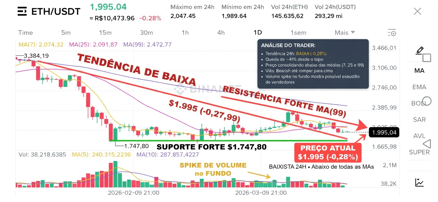 Preço despencou de 3.384 pra 1.995 (queda brutal de ~41% desde o topo), e nas últimas 24 horas perdeu -0,28% enquanto continua firmemente abaixo de TODAS as médias móveis (MA7 em 2.074, MA25 em 2.091 e MA99 em 2.472).