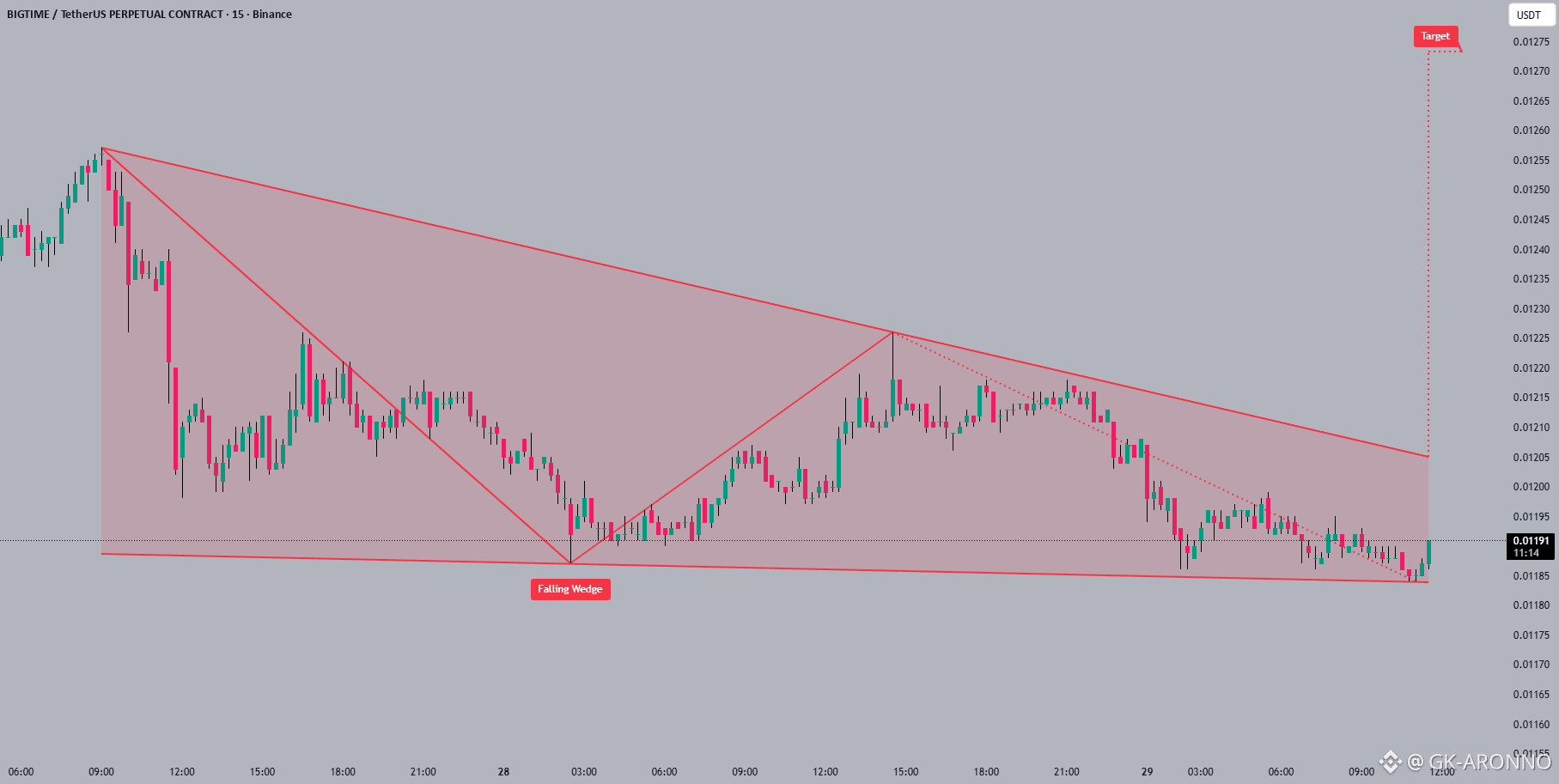 #BIGTIME is currently trading at the bottom of a falling wedge pattern 📉. The falling wedge is a bullish pattern 🐂 that typically indicates a potential breakout to the upside. The next target for #BIGTIME after breaking out of the wedge is around 0.01275 🚀.