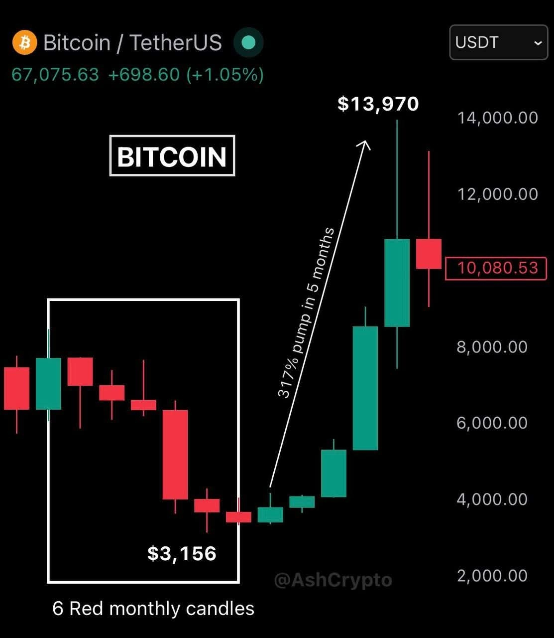 And here’s the interesting part: the last time this happened, Bitcoin didn’t stay down for long. It surged 317%, jumping from $3,349 to $13,970 in just five months.