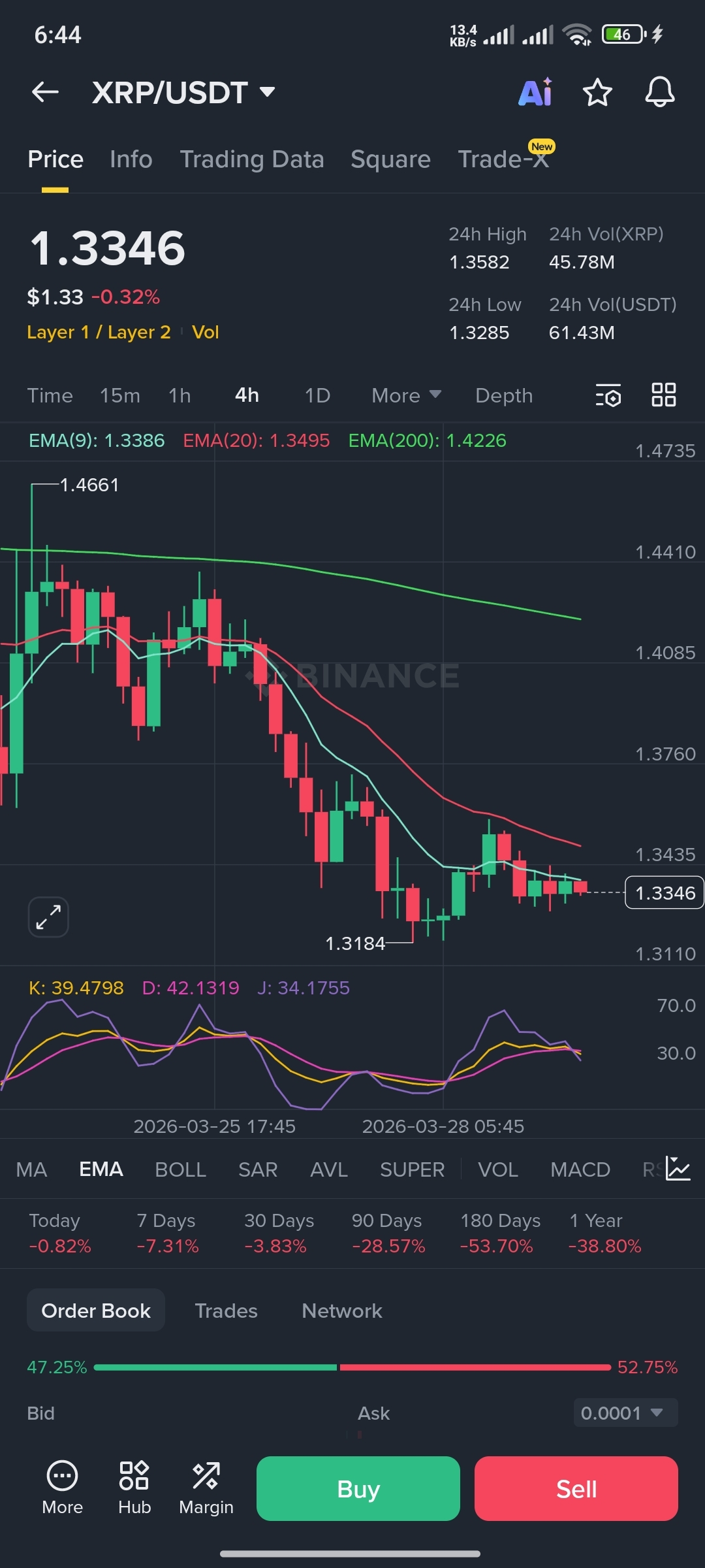 $XRP XRP is trading around $1.33–$1.35, showing a slight decline as the broader crypto market faces instability.