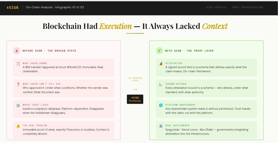 That's what actually got me reading about Sign Protocol. Not a price target someone dropped in a group chat, not a thread about tokenomics. The fundamental architectural gap it's trying to close. Because if you strip back all the noise around Web3, what you're left with is a world where execution is trustless but context is completely absent. Sign is trying to fix context. That's a harder problem than most builders want to admit.