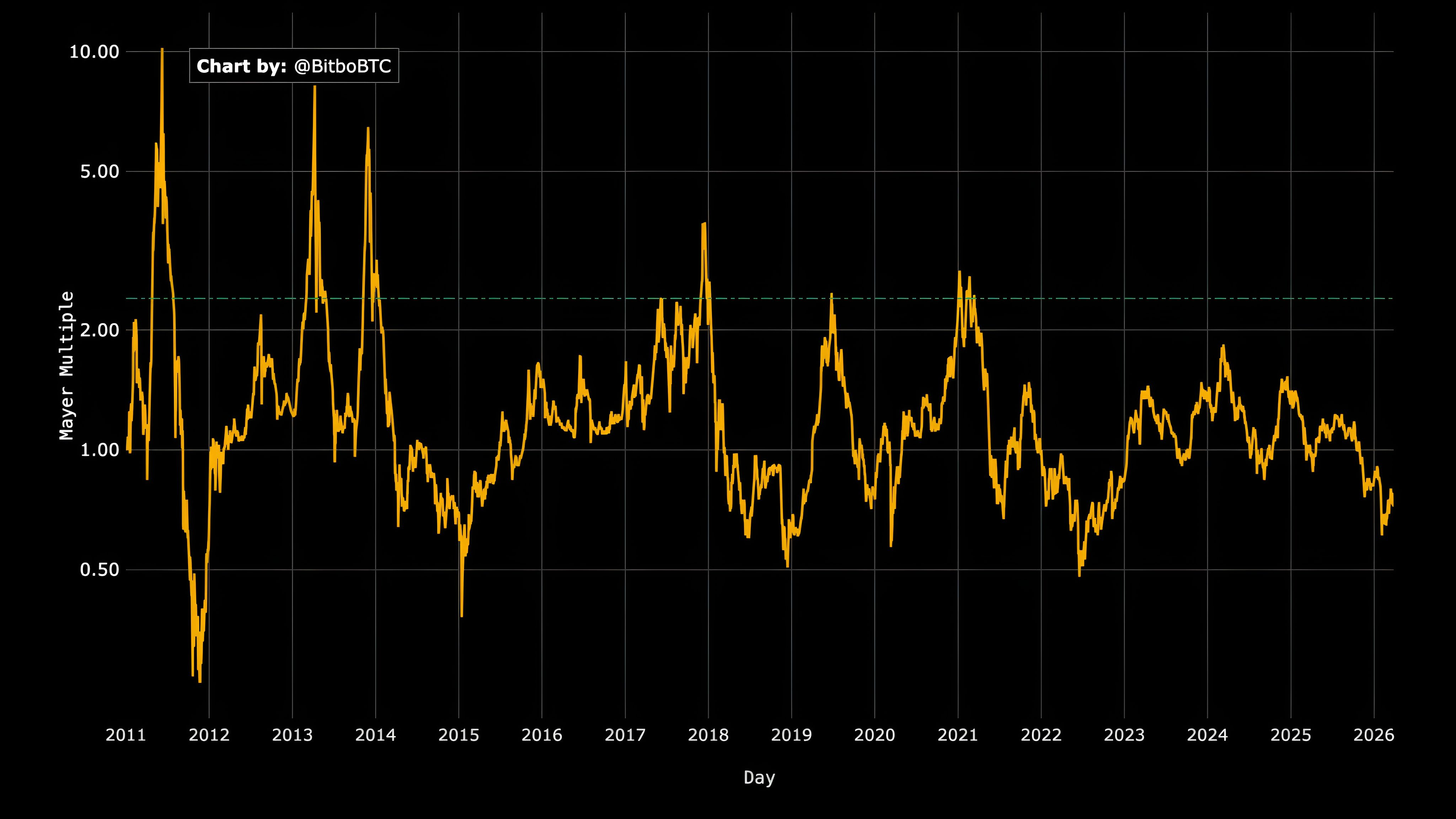 One key indicator, the Mayer Multiple, shows BTC trading near the lower end of its historical range. In simple terms: