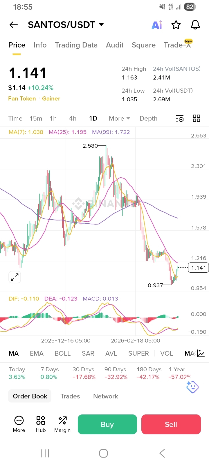 * **Current Price Action:** SANTOS is currently trading around **$1.12**, showing a strong recovery (+13% to +14%) in the last 24 hours after hitting a weekly low near **$0.94**.
