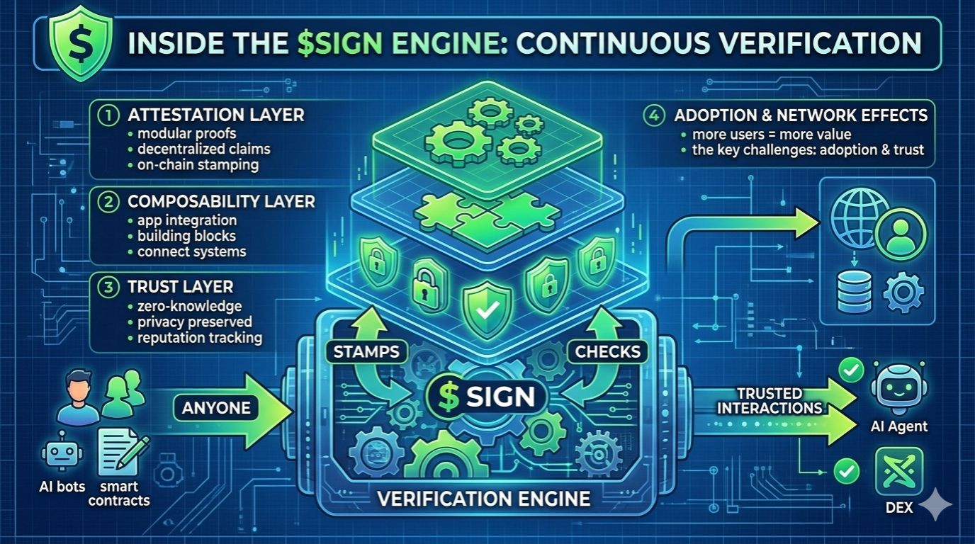 So, $SIGN tries a new angle:So, “modular on-chain attestations.” It’s kind of a mouthful, right? But here’s what it means: anybody can toss out claims—regular folks, big companies, even those automated smart contracts. And not just tossing them out, they can check each other too. They stamp these attestations on-chain, so there’s a trackable, verifiable record, but nobody’s forced to expose all their private data. It doesn’t just cover identity; it handles reputation, credentials, proofs you participated in something—sort of a bundled system other apps can plug into.