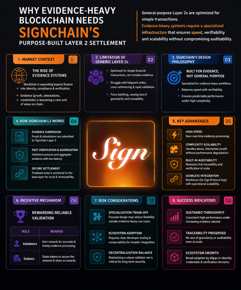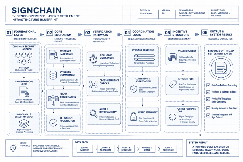 What stands out to me is how Signchain treats this not as a throughput problem alone, but as a structural one. Traditional L2 architectures are primarily optimized for financial transactions..simple state transitions with clear finality. But evidence systems introduce different pressures frequent writes, layered attestations, cross-referencing, and the need for rapid validation without sacrificing auditability.