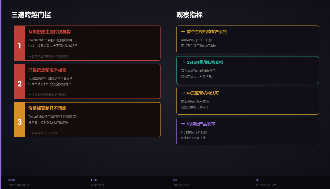 TokenTable目前的主要客户是加密原生项目——Kaito、DOGS、ZetaChain这类。这些项目用SIGN代币管理类股权分配。从加密原生项目跨越到传统主权财富基金,需要在法律框架、监管对接、用户习惯上做大量的适配工作。这个跨越有多难,TokenTable目前没有公开的传统机构客户案例。