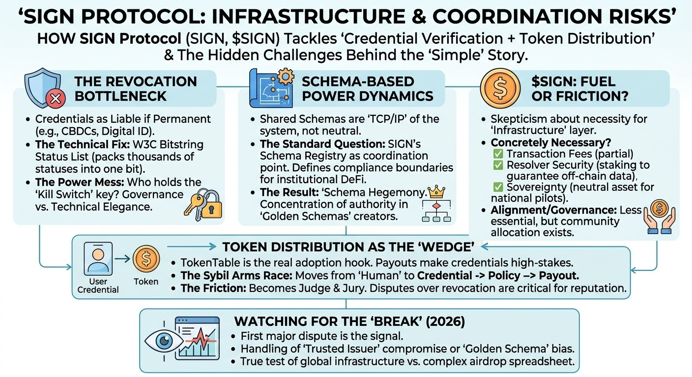 second is the distribution layer. honestly, this looks like the most concrete part of the stack right now. “token distribution” sounds simple until you’ve had to operate one. sybil resistance, wallet clustering, region restrictions, claim windows, proofs of participation, failed transactions, user support — it gets ugly fast. SIGN seems to be building the path from credential issuance straight into allocation and claiming, which is much more useful than a generic attestation registry. but here’s the thing: when verification directly influences payouts, the protocol stops being neutral plumbing. every issuer choice, every eligibility threshold, every revocation path has governance implications whether the docs say so or not.