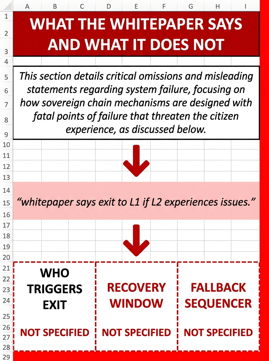 First, who actually triggers the L1 exit. Is it the government entity operating the sequencer. Is it a validator node that detects the failure automatically. Is it an automated on chain rule that fires when a defined threshold is breached. The whitepaper does not say. In a real failure under pressure that ambiguity becomes a second crisis layered on top of the first one. While decision makers argue about who has authority to act, citizen transactions remain completely frozen.