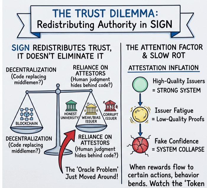 SIGN doesn’t kill trust; it just moves it around. If an attestor is weak, biased, or just plain corrupt? The whole system tips over. You haven't solved the "oracle problem"—you’ve just dressed it up in better clothes. I’ve seen too many projects pretend that math replaces human judgment. It doesn't. It just hides the human mess behind a wall of code.