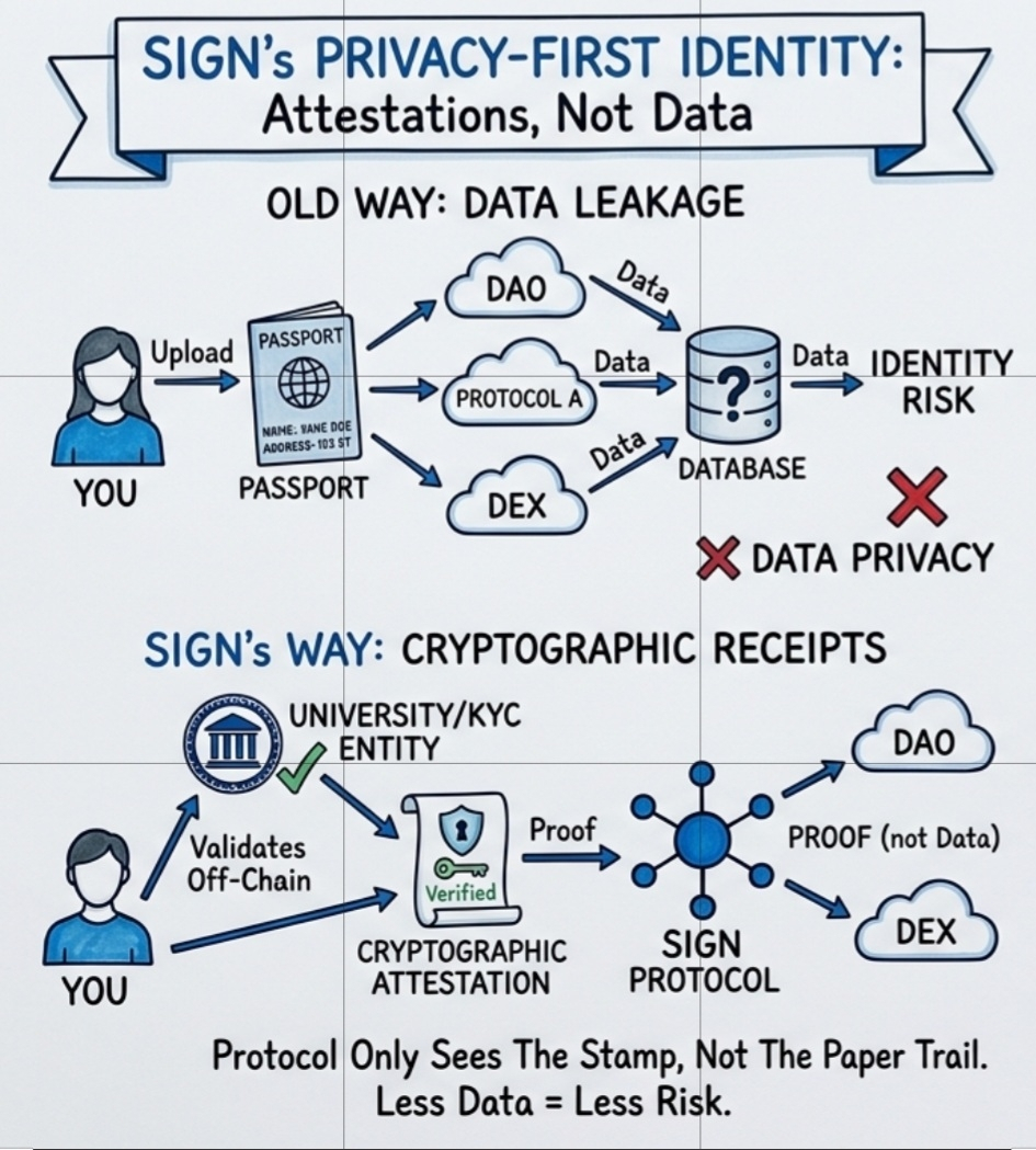 Here’s the move: They don’t store "you." They store attestations. Think of them as small, sharp claims: "This person passed KYC." "This person graduated." It’s not your home address or your mother’s maiden name. It’s just a little cryptographic sticky note saying someone credible vouched for this specific fact. Suddenly, you aren't leaking data every time you log in; you’re just carrying receipts.
