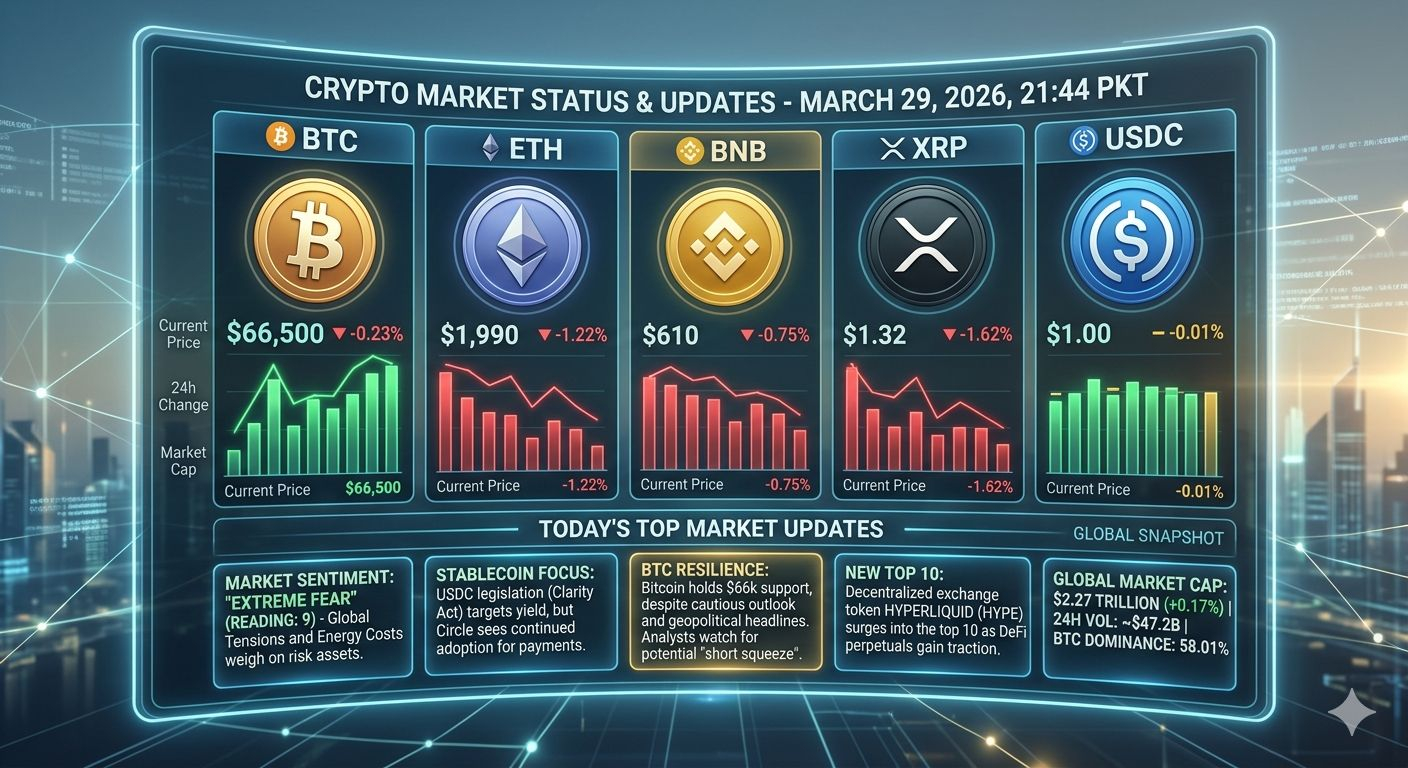 As of Sunday, March 29, 2026, at 9:44 PM PKT (4:44 PM UTC), the cryptocurrency market is navigating a complex landscape of 'Extreme Fear'—marked by a reading of 9 on the Fear & Greed Index—driven by continued geopolitical tensions in the Middle East and concerns over rising energy costs impacting risk assets. Despite this, major assets like Bitcoin are showing resilience, holding above key support levels.