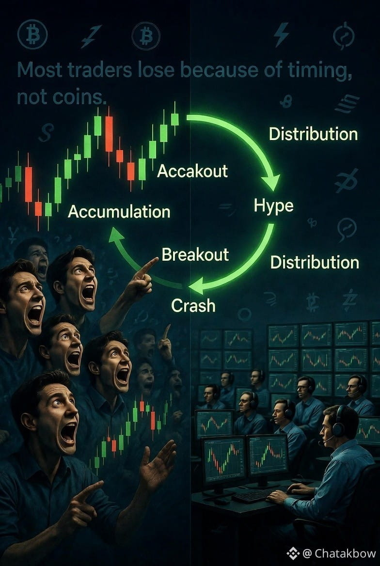 Every market moves in a loop: Accumulation ā Breakout ā Hype ā Distribution ā Crash