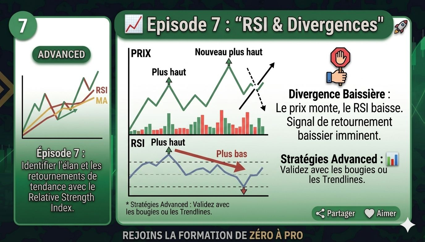 Le RSI n'est pas juste pour les zones 70/30. Les divergences sont votre meilleur allié pour sortir avant le krach ou entrer juste avant l'explosion !