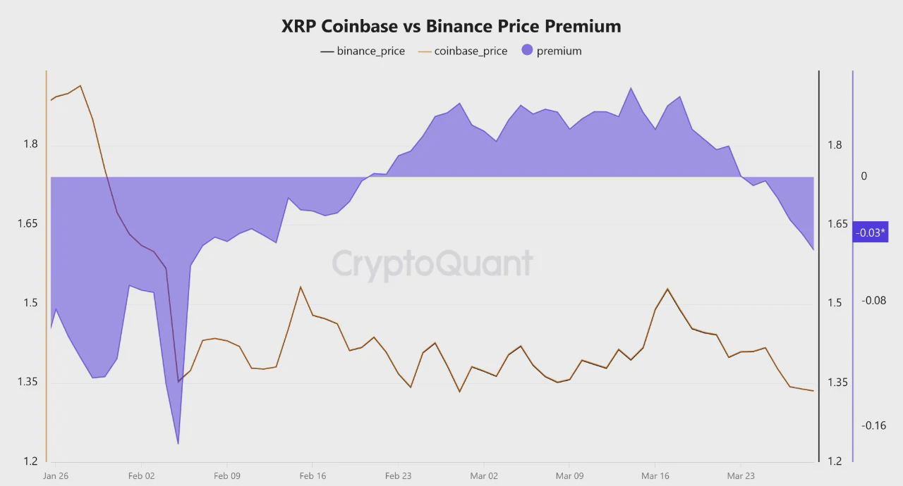 Between March 10 and March 22, the premium held between +0.04 and +0.05 while XRP remained stable above $1.35 to $1.40. Starting March 23, the premium began a continuous decline. The current reading stands at -0.0364 - Coinbase is now pricing XRP below Binance, reflecting declining institutional demand on Coinbase and increased retail buying activity outside the United States.