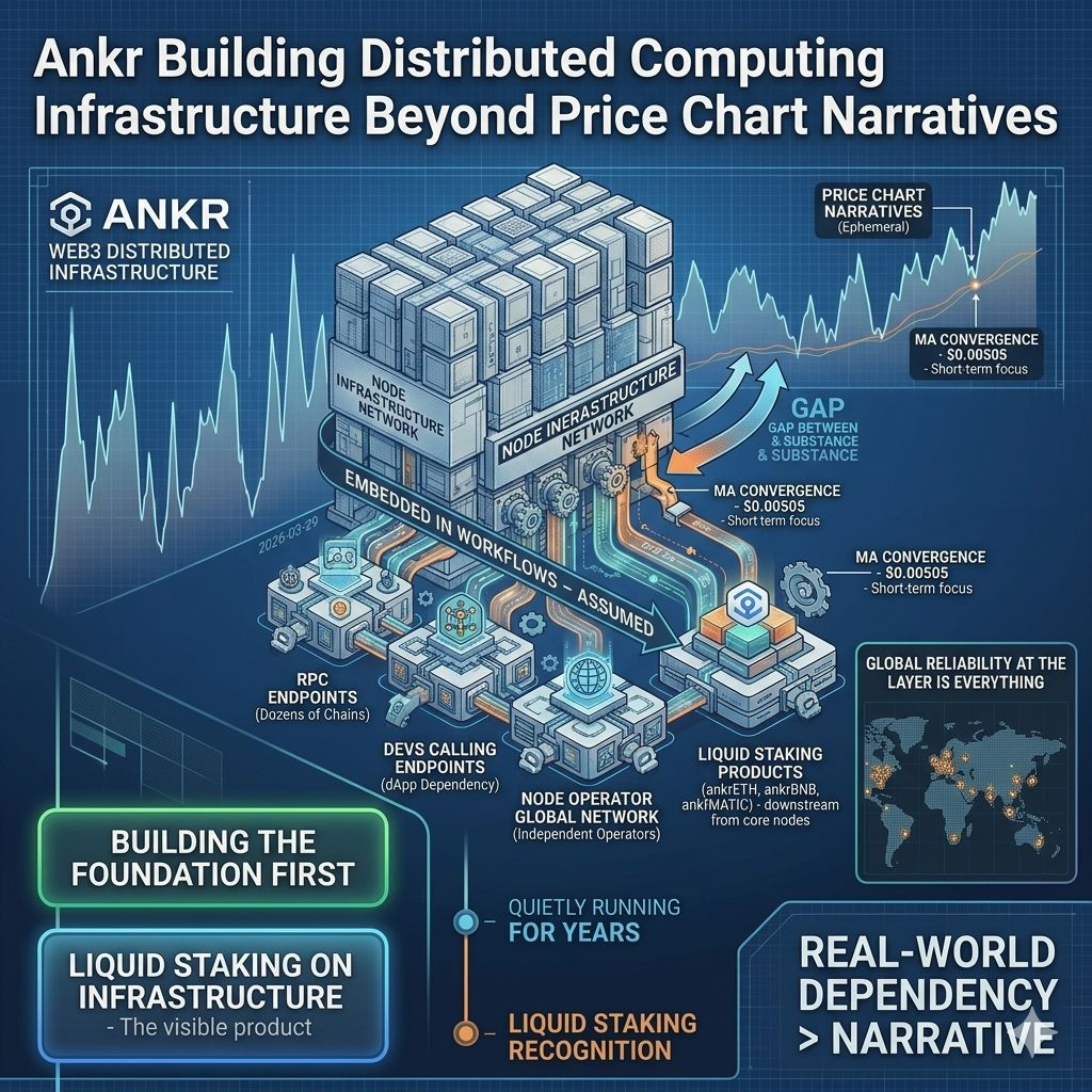 What they're not seeing is that somewhere behind that chart, Ankr is running RPC nodes for dozens of blockchains simultaneously. Developers are calling those endpoints right now. dApps are depending on that infrastructure to stay alive. That activity doesn't show up in the candlestick. It never does.