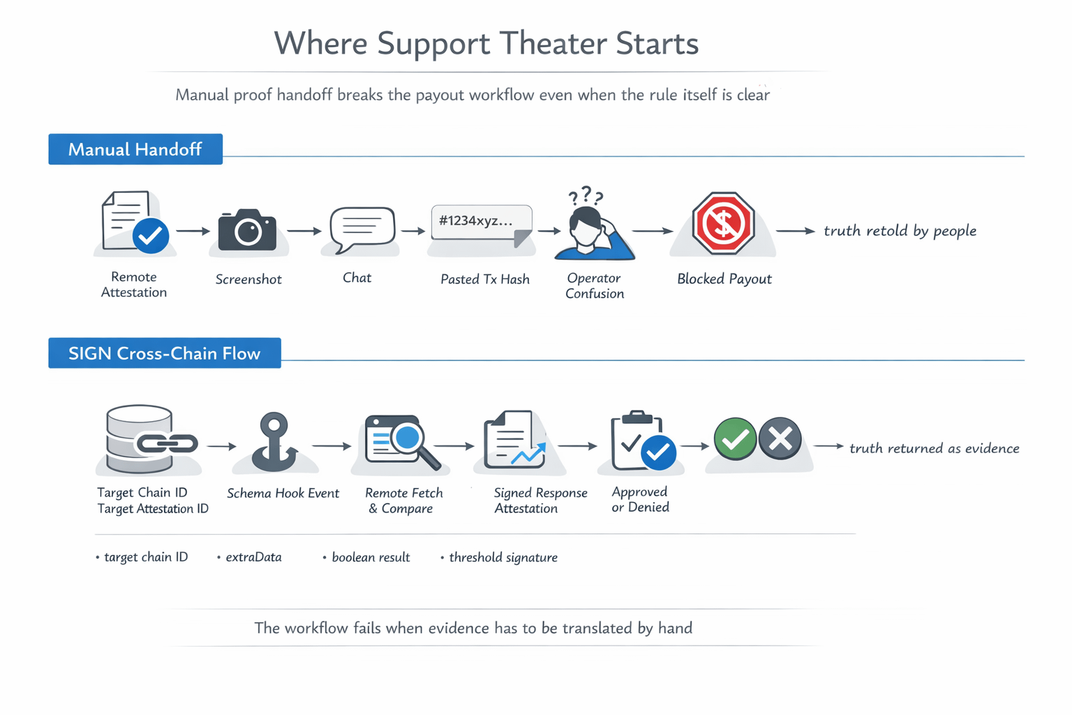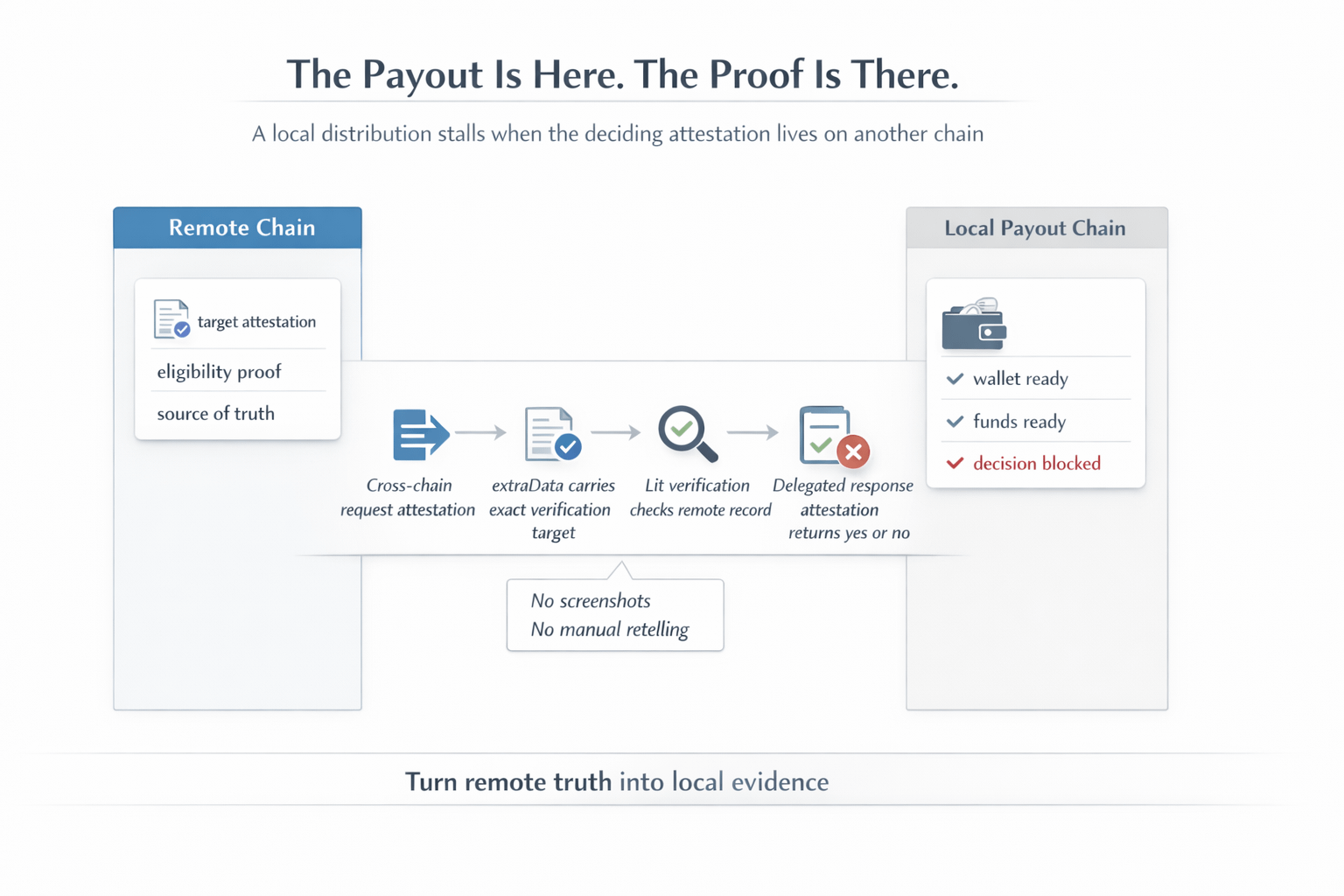 I kept picturing one wallet sitting in a payout run, fully lined up for release, but still frozen. The payout table is here. The claim window is here. The operator reviewing the row is here. But the fact that decides whether this wallet should be paid was attested somewhere else on another chain. That is the support problem I keep coming back to. Not because the rule is confusing, but because the proof that unlocks this one payout is stranded somewhere the local flow cannot act on by itself.