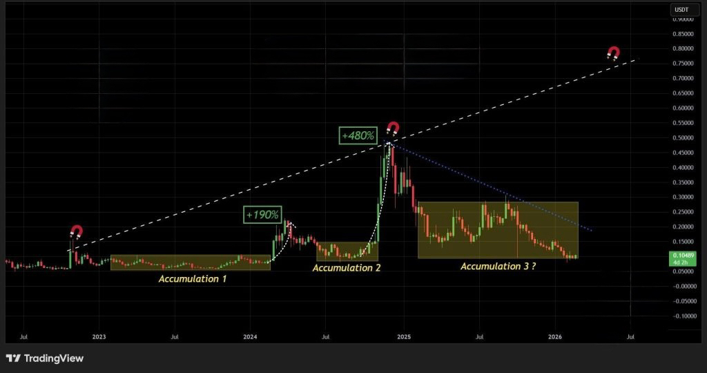 En 2023, DOGE a traversé une longue phase latérale avant de sortir et de grimper d’environ 190 %. Puis en 2024, le même cycle s’est répété, mais le mouvement était plus important, environ 480 %, atteignant près de 0,50 $. Maintenant, nous pourrions être dans une troisième phase d’accumulation.
