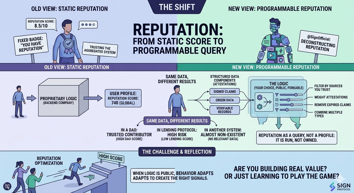 Dưới góc nhìn của @SignOfficial , giả định đó bắt đầu nứt ra. Reputation không còn là một kết quả cuối cùng, mà là tập hợp của các attestation những claim có chữ ký, có nguồn gốc, có thể verify. Thay vì tin vào một hệ thống tổng hợp, bạn có thể nhìn vào từng mảnh dữ liệu cấu thành nên “uy tín” đó.