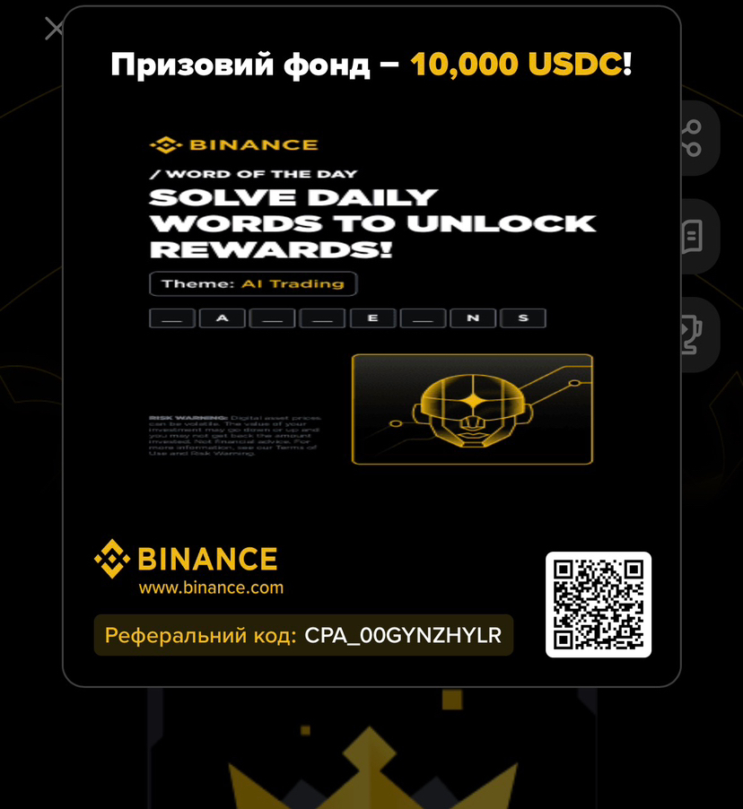 Binance зустрічає фразою: "Знання — це сила". Забираю максимальний результат — 7 із 7 успішних ігор у Word of the Day. Свій шматок із пулу в 10,000 USDC забезпечено. Але найцікавіше тут — сама тема тижня: AI Trading (ШІ-трейдинг).