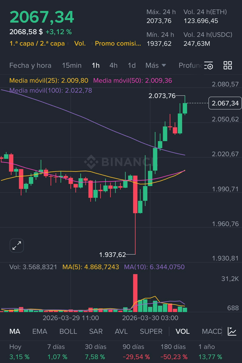 • 2. "V" Recovery and Break of MAs: The most relevant aspect is not the fall, but the reaction. The price has robustly recovered the zone of $2,000 and has simultaneously pierced the three key moving averages: MA(25), MA(50), and MA(100).