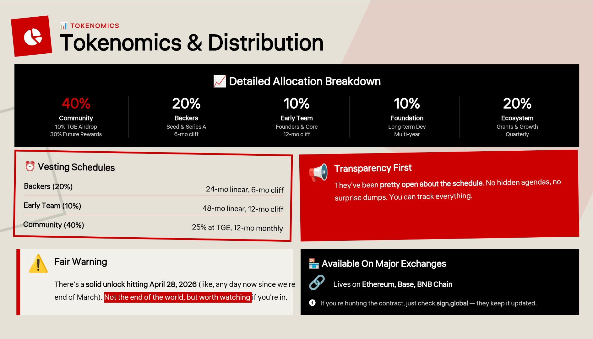 Token split feels decent: around 40% to the people who actually built and used it early (team, backers, OGs), 60% for growth and bringing in new folks. They’ve been pretty open about the schedule. Fair warning though — there’s a solid unlock hitting April 28, 2026 (like, any day now since we’re end of March). Not the end of the world, but worth watching if you’re in.