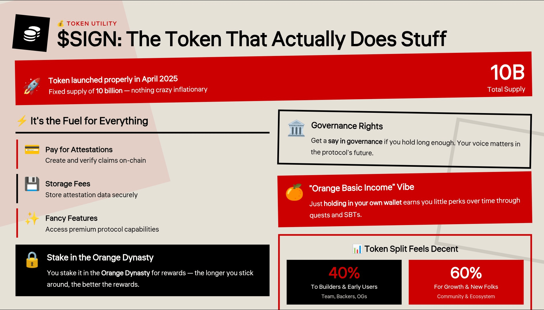 The token launched properly in April 2025. Fixed supply of 10 billion, nothing crazy inflationary. It’s the fuel for everything — pay for attestations, storage, fancy features. You stake it in the Orange Dynasty for rewards, get a say in governance if you hold long enough, and there’s even this “Orange Basic Income” vibe where just holding in your own wallet earns you little perks over time through quests and SBTs.