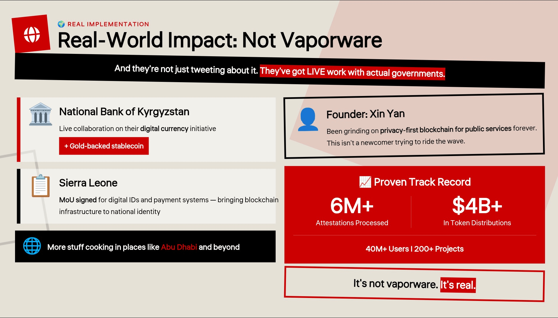 And they’re not just tweeting about it. They’ve got live work with the National Bank of Kyrgyzstan on their digital currency (and a gold-backed stablecoin), an MoU with Sierra Leone for digital IDs and payments, and more stuff cooking in places like Abu Dhabi. Founder Xin Yan has been grinding on privacy-first blockchain for public services forever, and they’ve already helped millions of users move billions in digital assets. It’s not vaporware.