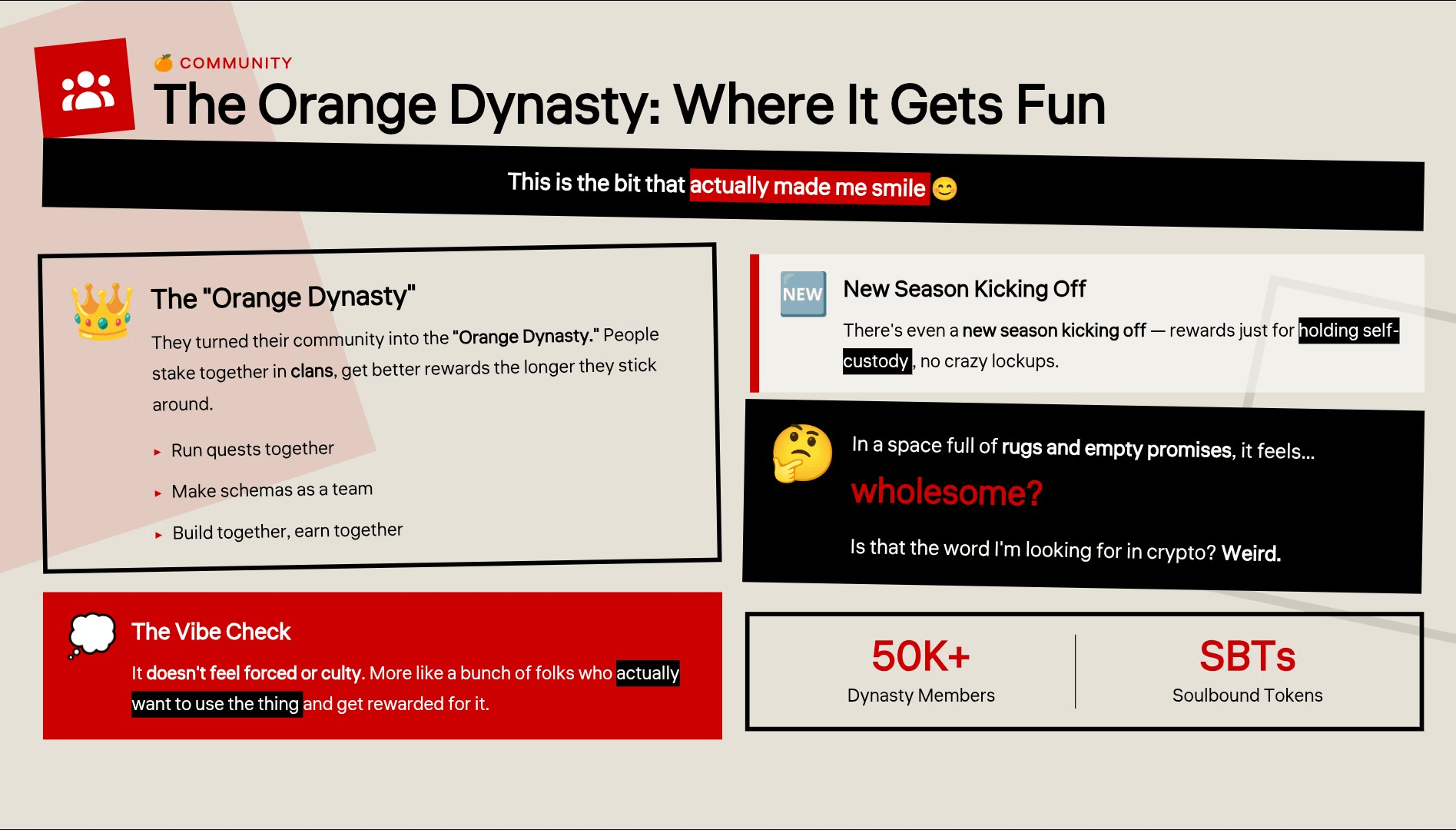 This is the bit that actually made me smile. They turned their community into the “Orange Dynasty.” People stake together in clans, get better rewards the longer they stick around, run quests, make schemas, all that. It doesn’t feel forced or culty. More like a bunch of folks who actually want to use the thing and get rewarded for it. There’s even a new season kicking off — rewards just for holding self-custody, no crazy lockups. In a space full of rugs and empty promises, it feels… wholesome? Is that the word I’m looking for in crypto? Weird.