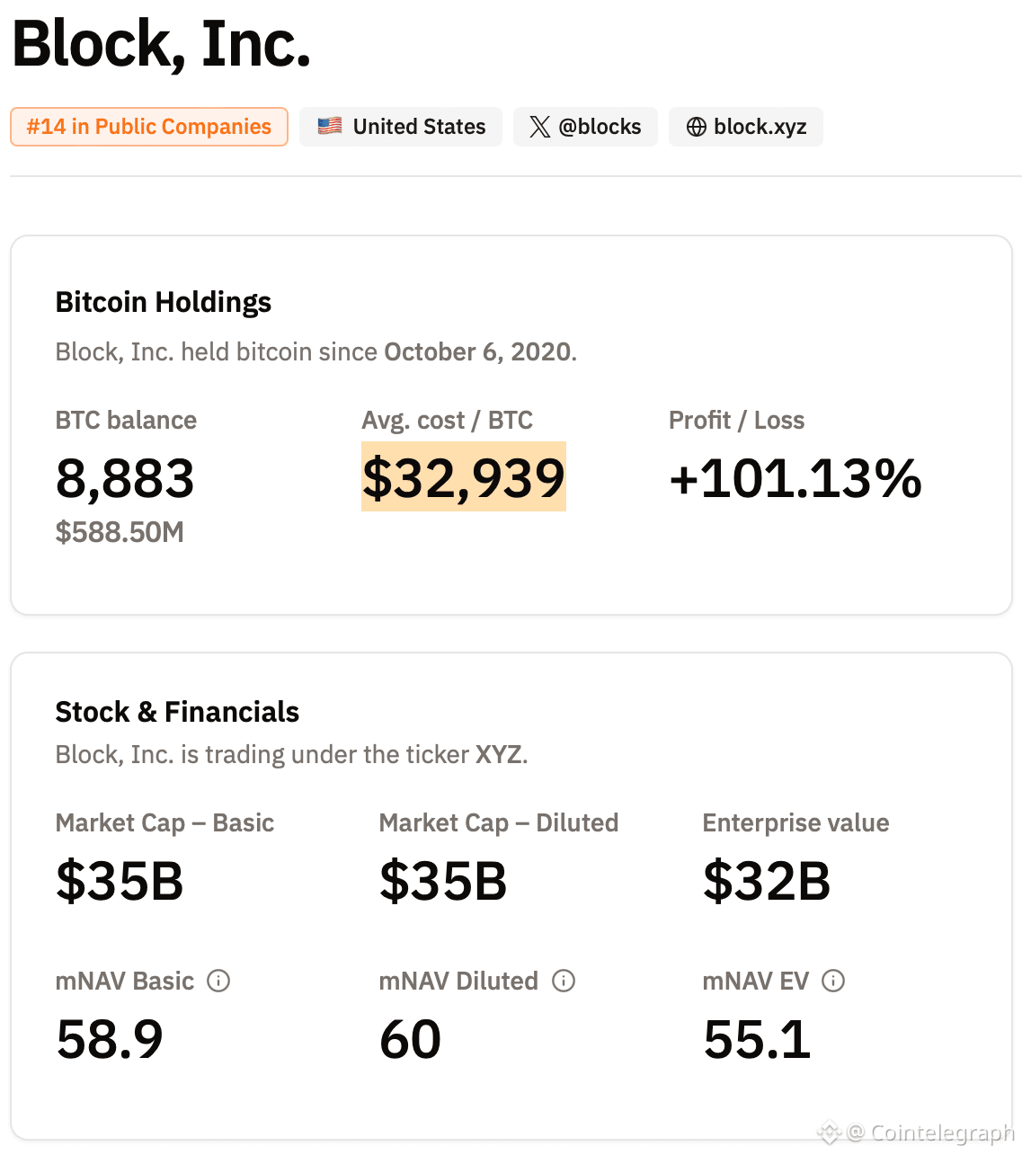 According to BitcoinTreasuries.net data, Block ranks as the 14th-largest publicly traded holder of Bitcoin, with 8,883 BTC on its balance sheet at an average cost of $32,939 per coin.
