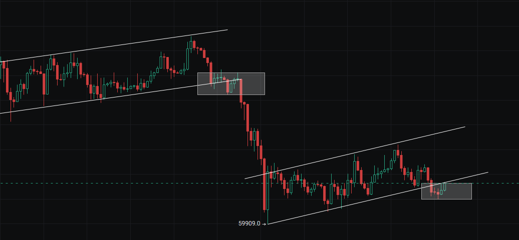 比特币中线下跌趋势行情已经悄然开启,短期的死猫反弹波动改变不了下跌趋势。6.8 万附近是一个很强的阻力价位区域也是价格跌破48日上升趋势线后的反弹后续横盘震荡几天后价格大概率会大跌。
