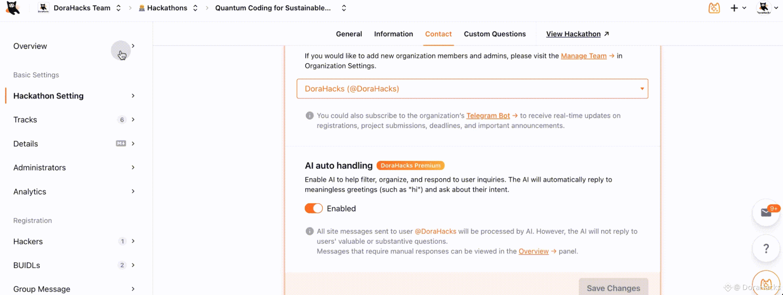 Today, we are introducing Supervised Fully-Autonomous Hackathon (FAH) Mode in the DoraHacks Dashboard. It adds co-organizing capabilities and consolidates existing Hackathon AI features into a single console, allowing you to manage AI automation from one place.